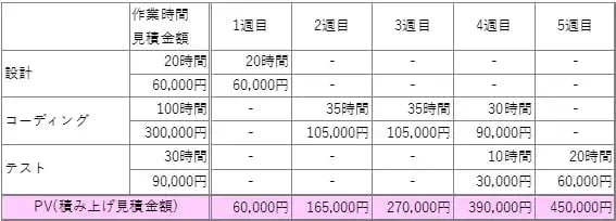 図2のように5週間かけて完成させる計画にした場合、工程別に1週間でどれくらいの作業を実施するかを見積もることになります。例えば設計工程は20時間かかると見積りし、1週目で全て仕上げる計画とします。Rさんの時間単価は3,000円ですので、1週目のPVは60,000円となります。コーディングやテスト工程についても同様に計画します。1週間ずつの計画金額の積み上げが計画値PV(Planned Value)となります。そして最終的な金額がプロジェクトの実行予算(見積原価)となるわけです。