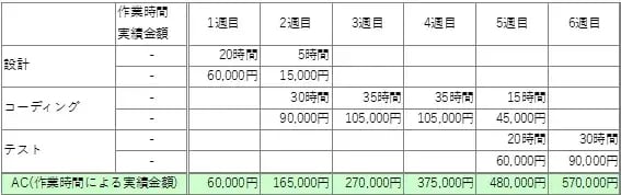 Rさんの単価は450,000円/150時間(3,000円/1時間)です。設計、コーディング、テスト工程にわけ、1週間ごとの計画を立てました。