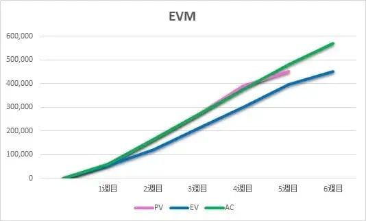 横軸ではPVとEVの差によりスケジュール差異が測れます。PVでは5週目に終わる予定なのにEVは6週目まで伸びていますのでこのままいくとスケジュール遅延になります。また縦軸ではEVとACの差によりコスト差異が測れます。EVでは450,000円の出来高に対し、ACは570,000円となりコスト超過となりそうなのがわかります。