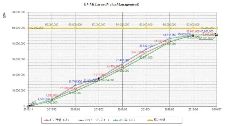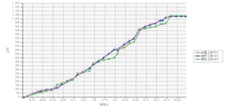 EVMを管理する場合、最終的なコスト(予算と実績)だけでなく、途中途中の金額(計画と実績)をグラフ化しなければなりません。ここまでで100万円、ここまで来たら300万円というふうに計画値(PV)を線で表し、実際にかかったコスト(AC)も線で対比させます。 人によって単価も異なりますので、計画や実績を捕捉するのは結構大変な作業です。