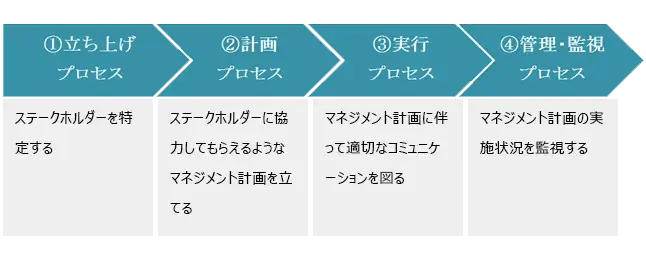PMBOKにおけるステークホルダーマネジメントは下記のプロセスに従って実施することとされています。