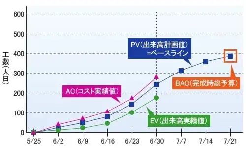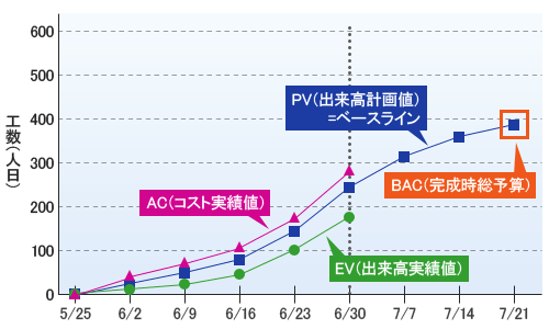 EVがPVを上回り(計画よりも実績が上)、ACがEVを上回っている(かかったコストが出来高を上回る)場合、前半に生産性が落ちるなにかのトラブルが起きていることが推測されます。