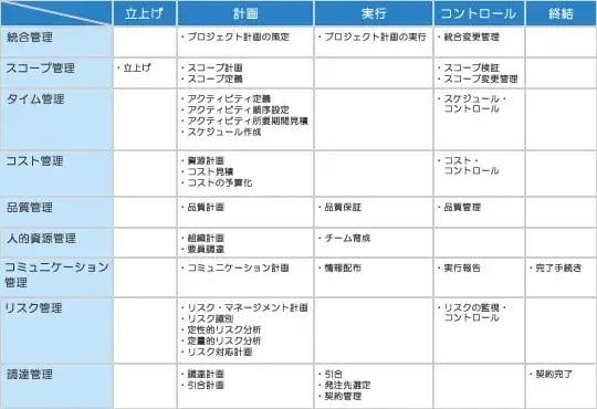 また、調達管理の例としては、購買部門が行う協力会社からの要員の調達です。PMが必要としているスキルを持った要員をプロジェクトの期間に合わせて適切なコストで調達することが必要です。もちろん、PMが調達した結果の承認を行うことも重要です。