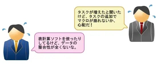 しかし、本当にルールを決めれば出来ることでしょうか? メールに添付され増殖したものから最新の表を見つけだすことが素早く正確に出来るでしょうか。しかも工事進行基準への対応や多くのステックホルダーへの適切な報告、PMBOKの適用など最近のプロジェクト管理に要求されるレベルはどんどん高度になっています。それらの要求に対して正確に対応するには、表計算ソフトでは、限界があります。