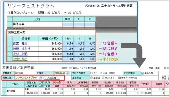 これを元に図2下の要員積上による原価見積が自動的に作成されました。