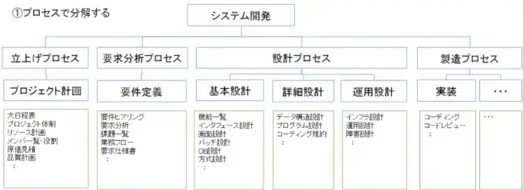 例えば、システム開発だと、立上げ→要求分析→設計→製造といったプロセスに分けてそれぞれで必要な成果物・タスクを定義していきます。
