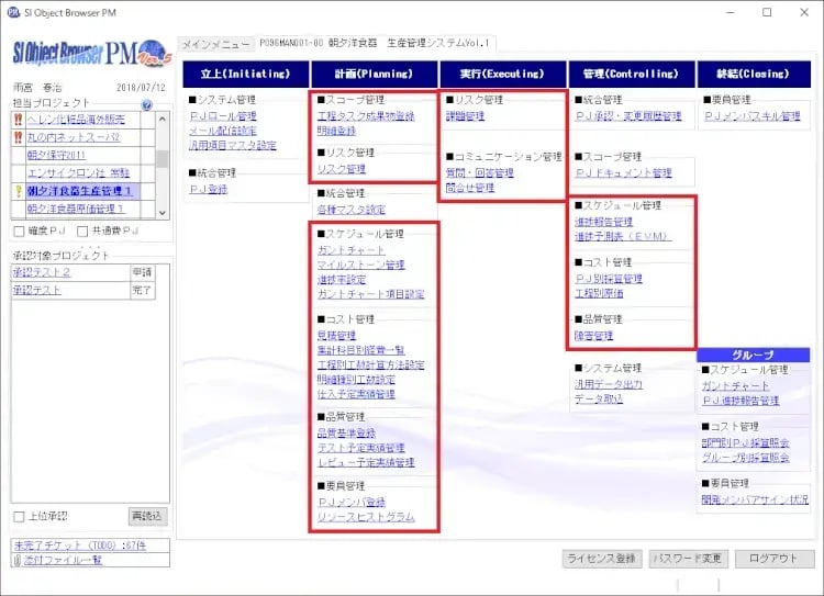 管理メニューでは、プロジェクトの進捗や課題をEVMや報告ですぐに把握でき、プロジェクトの採算も月別に原価の内訳レベルで把握できます。