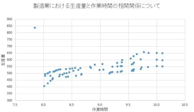 各データを示す点のグラフ上に配置された様子から、2種類の項目が強く関係しあっているのか、または一方の項目がもう一方の項目の影響を受けているのか、といった内容を検証することが可能です。そのため、「製品の強度と比重」、「消費電力と気温」など、関連性が予測される2種類の項目の関連性を確認したいケースでの活用に適しています。