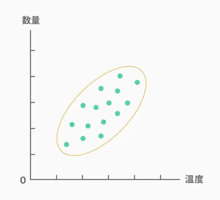 散布図を作成した際に、2種類の項目のうち一方の値が増加するほどもう一方の値も増加しているケースが正の相関です。打点と打点の距離が近く、狭い範囲にまとまっているほど互いに強く関係しており、打点が広範囲に位置しているケースでは弱い相関状態であることが分かります。