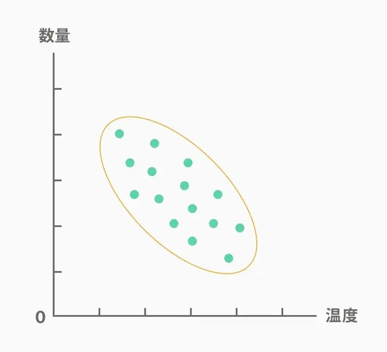 負の相関とは、2種類の項目のうち一方の値が増加するほどもう一方の値が減少しているケースのことです。正の相関と同様に、打点と打点の距離が近く、点在している範囲が狭いほど負の相関が強い状態であり、2つの項目がお互いに強い影響を受けていることが読み取れます。