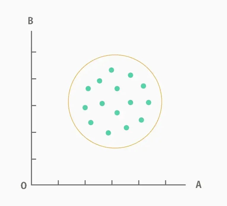 相関がないケースは、2つの値の増減に規則性がなく、打点がグラフ上にランダムに点在している状態です。この場合、一方の項目の数値が増加しても、もう一方の数値が増えたり減ったりすることはありません。