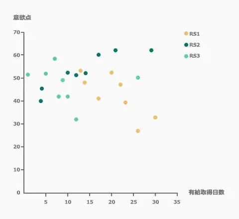 軸に数量を設定したあとは、座標上に点を配置(打点)していきます。グラフの目盛りから位置を割り出して座標上に打点していくと、2種類の項目の数値に相関関係があるかどうかが可視化されます。