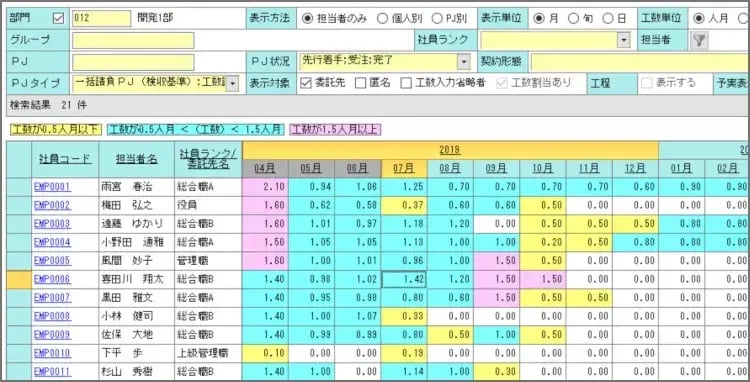 直近の数か月と先の予定月が赤くなっている人は、負荷が高い状態のため、計画の見直しとケアが必要かも知れません。