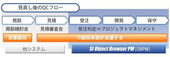 IT統括本部ができる前のISO9001は「システム開発部分中心」であったため、そのQCフローを大幅に見直し、商談⇒見積⇒受注⇒開発⇒保守の全体業務を見ていくQCフローに変えました(下記図参照)。その新QCフローを実行していくために、プロジェクト状況が把握できて、管理手法を統一できるツールの検討に入りました。「国産・海外製の10社のプロジェクト管理ツールを検証しました」と語る荒川氏。