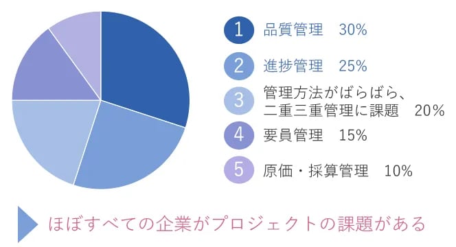 2020年12月に行われたプロジェクトマネジメントDAYのアンケートによると、約80%の企業がDXに関するプロジェクトを実施・準備しています。しかし、約60%がExcel、15%がクローズドな現場ツールでプロジェクト管理しており、組織全体の効率化ができていません。この結果、下記グラフのように品質や進捗、原価、要員などの管理に課題があると認識している企業が多く、DXをうたえどプロジェクト管理に関しては旧態のままという状況が浮き彫りになっています。
