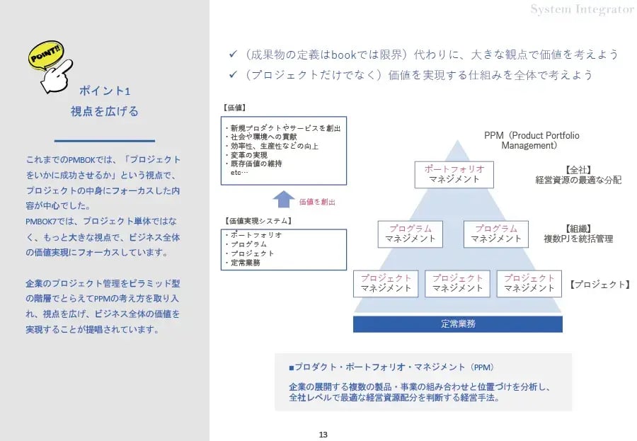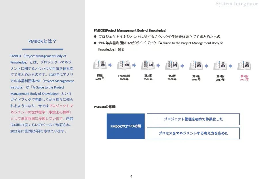 「そもそもPMBOKとは?」、「最新版PMBOK7でどう変化したのか?」など、PMBOK最新版の本質を正しく理解するためのポイントについて合計23ページでご紹介しています。ぜひプロジェクトマネジメントの改善にお役立てください。