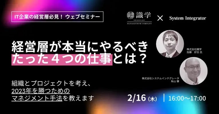 ![[IT企業の経営層必見! ウェブセミナー] 経営層が本当にやるべきたった4つの仕事とは?組織とプロジェクトを考え、2023年を勝つためのマネジメント手法を教えます 1](https://products.sint.co.jp/hs-fs/hubfs/resource/obpm/seminar/20230216-01.webp?width=765&height=400&name=20230216-01.webp)
