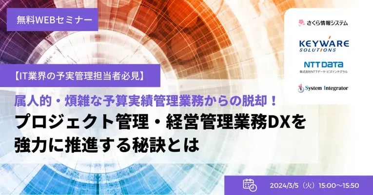 予算実績管理は、企業経営において重要な指標となります。特にIT業界のようにプロジェクト単位で業務を行うビジネスにおいては、業務や部門ごとにシステムがバラバラに稼働しているケースが多く、 ・プロジェクト単位の予実対比が会計システムの締め処理をするまで分からず不採算化を防止できない ・予実や見込管理をExcelやスプレッドシートで対応しており、業務属人化、非効率化が常態化しているなどのお悩みをよくお伺いします。適切な予算管理ができていないと、適正な投資や経費のコントロールができず、経営状況の悪化を招く恐れがあります。本セミナーでは、プロジェクト全体・予実管理全体をリアルタイムに把握し効率化するポイントを、豊富な経験を有するキーウェアソリューションズ株式会社様、株式会社システムインテグレータ様、さくら情報システム株式会社の担当者が、基幹システム・プロジェクト管理・予実管理の3つの切り口からそれぞれ解説します。■こんな方におすすめ! ・収支管理をシステム化できておらず、属人的な管理になっていて事業全体の収益を把握できていない ・Excelやスプレッドシートで管理しているが、業務負荷が高い ・プロジェクトの収支や売上見込みをタイムリーに把握できない ・進捗・要員・リスク・課題・障害等のプロジェクト管理が非効率で不採算案件を未然に防げない ・他社事例を収集したい