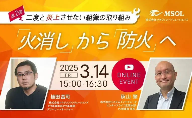 ※本セミナーは第2弾となります。 お申込みいただいた方へは、第1弾のアーカイブ動画をご案内させていただきます。「毎回振り返らせてるのに、うちはいっつも炎上してるなぁ」「必要だって言うからいろんなツールも導入してるのに、どうして効果が出ないんだろう」こんなお悩みをお持ちではありませんか?前回(2024年7月)のセミナーでは、炎上してしまった際にまずとるべき「火消し策」と、炎上する前に手を打てるようにするための「プロジェクト防火プロセス構築法」をお話しさせていただいたところ、多くの反響をいただきました。今回はその第2弾として、前回は深く触れられなかった「火消しから防火へ」のつなぎ部分のお話をさせていただき、炎上プロジェクトを少なくしていくための取り組みや考え、整理すべきポイントをご紹介させていただきます。株式会社マネジメントソリューションズの植田より、「火消し」後にやるべき取り組みを、株式会社システムインテグレータ秋山様より、「防火」の前に考えるポイントをお話しさせていただき、最後には前回同様、2名のパネリストによる対談も予定しております。