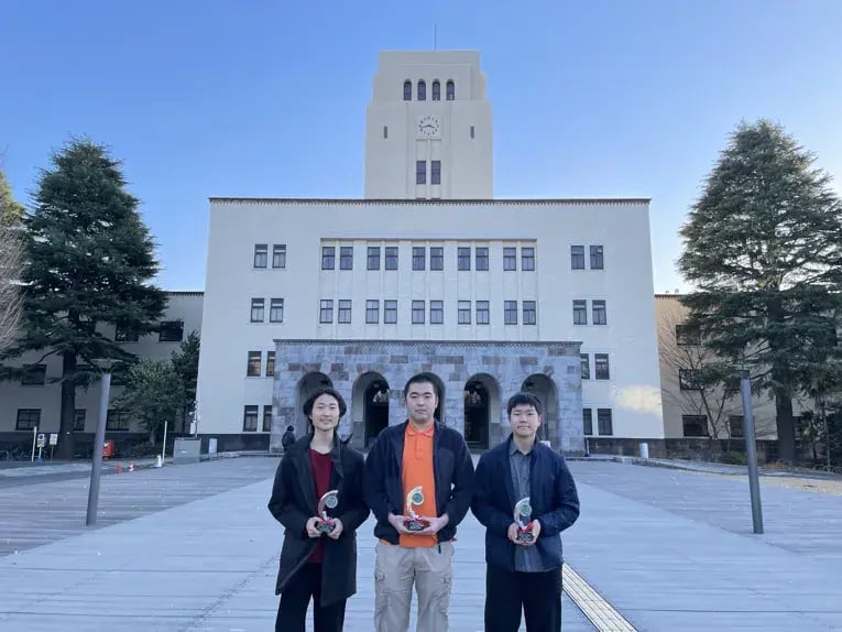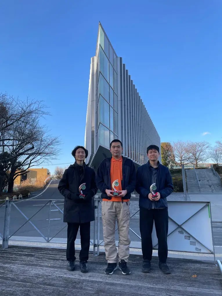 ※東京工業大学正門の前で、金、銀、銅の3つのトロフィーを持った『tonosama』の3名さま。真冬の寒風吹きすさぶ中、頑張って撮影に応じてくれました!