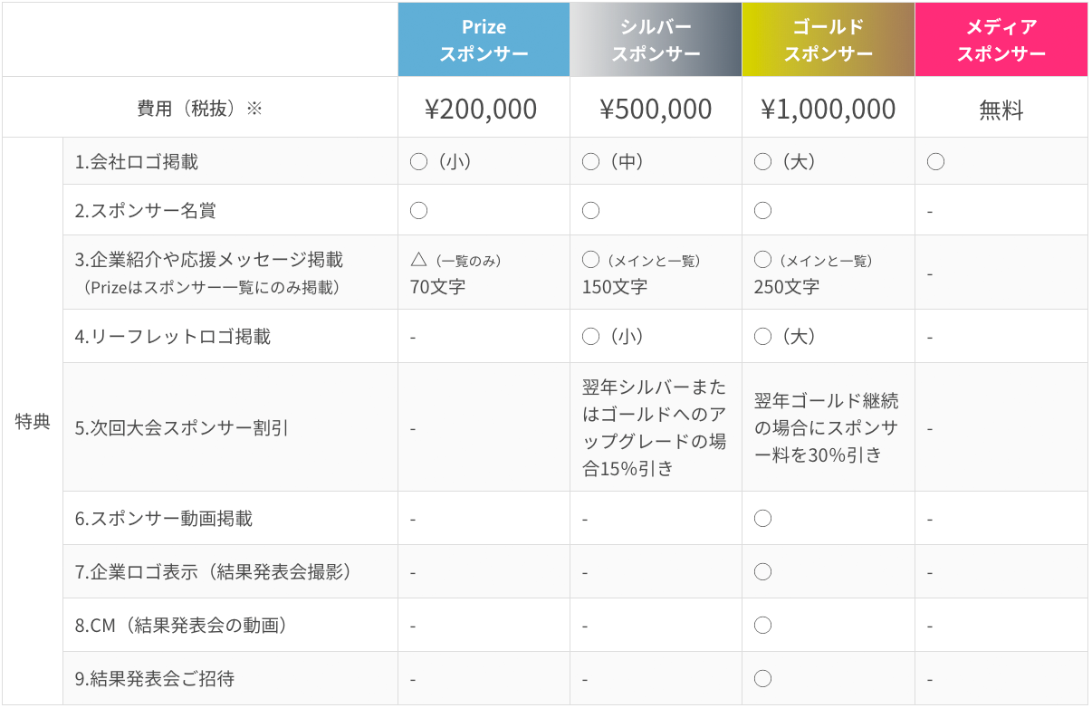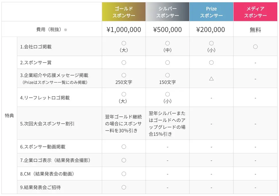 翌年ゴールド継続の場合にスポンサー料を30%引き | 翌年シルバーまたはゴールドへのアップグレードの場合15%引き | - | - | |