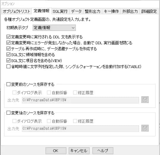 次にテーブル作成時の動作を見るために、メインウィンドウ中のメニューバー>「ツール」>「オプション」から、「定義変更時に実行されるDDL文を表示する」というチェックボックスにチェックを入れておきます。これによって、テーブルの作成・更新が実際に行われる前に、SQL文が一覧で表示されるようになります。