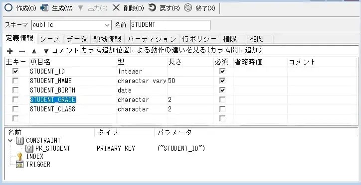 では既存のカラム間への追加ではどうでしょうか?“STUDENT_BIRTH”と”STUDENT_CLASS”の間に”STUDENT_GRADE”を追加して動作を見てみましょう。
