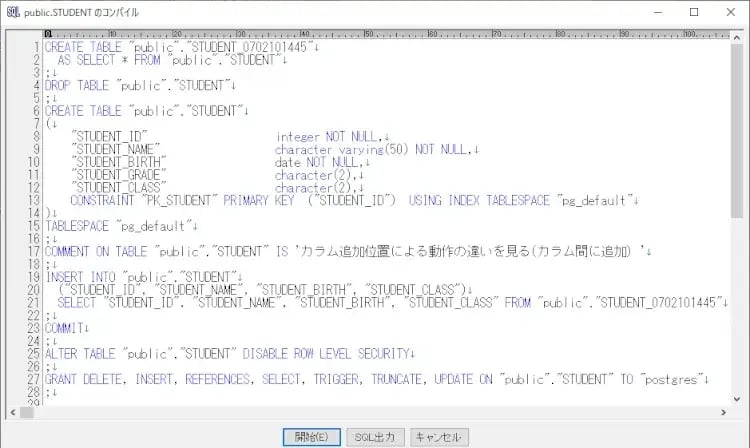 先程とは全く違う動作になりました。カラム間への追加を行うには、事前にテーブル情報を退避させ、一からテーブルの作り直しをする必要があります。再作成された”STUDENT”テーブルには新たに”STUDENT_GRADE”が追加されており、その後は退避させていたテーブル情報をもとに戻す手続きが行われます。