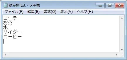 テキストファイルを開き、データを登録。「飲み物.txt」でファイルを保存します。