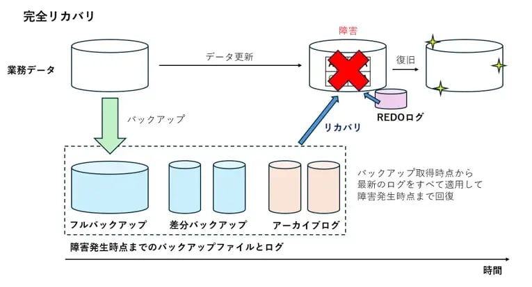 障害発生時点まで復旧することを完全リカバリと呼びます。具体的には、フルバックアップおよび差分バックアップ、バックアップ実施以降のログ(アーカイブログ、REDOログ)からリカバリを行います。