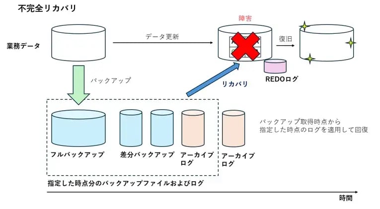 指定した時点の状態まで復旧させることを不完全リカバリと呼びます。具体的には、フルバックアップと指定した時点までの差分バックアップまたはアーカイブログファイルを使用して復旧します。
