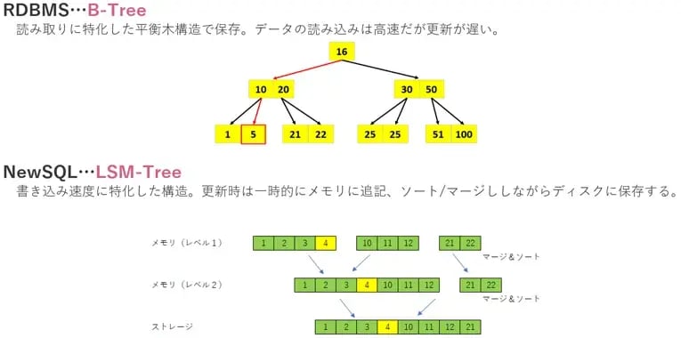 従来のRDBMSでは「B-Tree」と呼ばれるストレージ構造を採用していました。B-Treeはデータの読み取りが高速にできる反面、書き込みに時間がかかる欠点がありました。一方、NewSQLでは「LSM-Tree」と呼ばれるストレージ構造を採用しています。