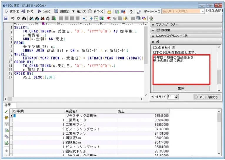 画面1の例では4半期ごとの商品売上を売上の高い順に表示するSQLを生成しています。この例はSELECT文の例ですが、UPDATEやDELETE文の自動生成も可能です。