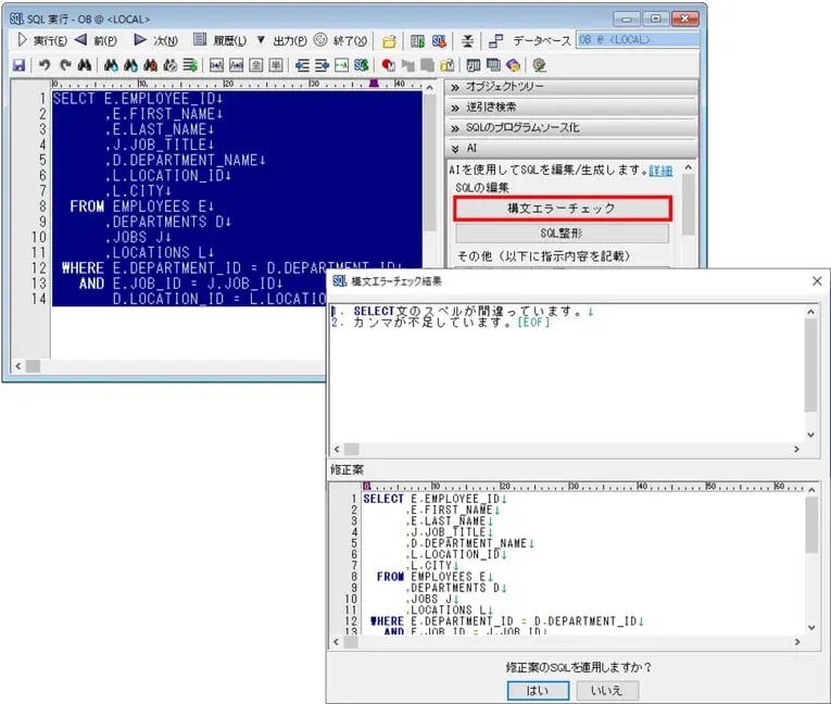 AIを介して自動で誤りの個所がチェックされます。この例では「SELECTのスペルが間違っている」「カンマが抜けている」などの誤りを指摘してくれています。また、あわせて修正後のSQLも提案してくれます。「はい」を押すと提案されたSQLがSQL画面に反映されるようになっていますので、誤りだけでなく、スピーディに修正することも可能です!