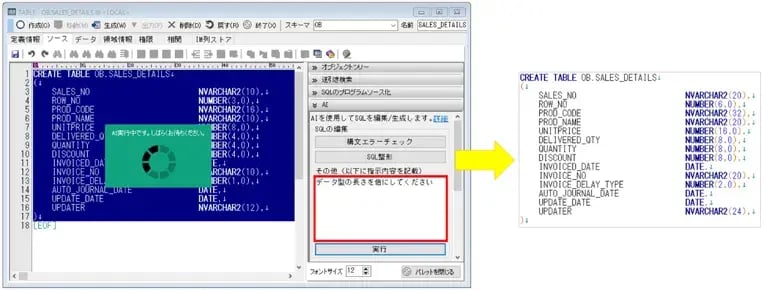 従来のバージョンでも大文字小文字変換などのシンプルな加工は可能でしたが、複雑な加工はできませんでした。最新バージョンでは例として、CREATE TABLE文で定義されているデータ型の長さを倍にするといった加工ができます。実行例は以下の通りです。このように、工夫次第で従来は手作業が必要であった、様々な変換作業を自動化することが可能となっています。