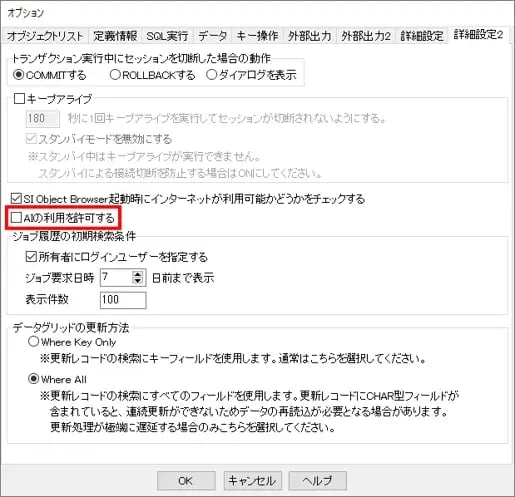 このように便利なAI連携機能ですが、以下の注意点もあります。 SQL等の情報がAIに送信される ※学習はされません 月あたりの実行回数制限がある これらの注意点があることから、AI連携機能は既定ではOFF(利用不可)となっています。「ツール」メニュー→「オプション画面」>「詳細設定2」タブより「AIの利用を許可する」のチェックボックスをONにすることで利用できるようになります。