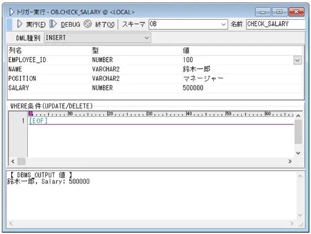 最新バージョンではトリガーの定義画面に「実行」ボタンが追加されています。ここから実行用の画面を呼び出すことが可能です。トリガーの実行画面では、トリガーの対象となるテーブルの各列に値の設定や、UPDATE/DELETEトリガー用に対象レコードの絞り込みなどの条件が設定できます。また、トリガー内でDBMS_OUTPUT.PUT_LINEを使用している場合は実行後にその結果も確認することができます。