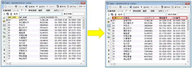 アイコンをクリックすることで列名の部分がコメントで定義された内容に切り替え表示されます。