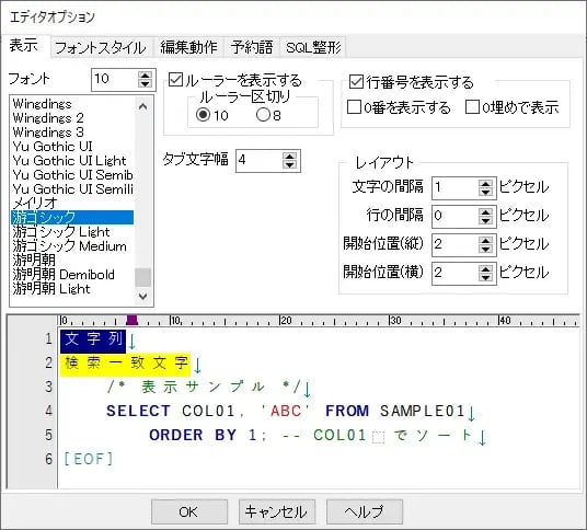 SQL実行画面のエディタ欄を游ゴシックのフォントに変更した例は以下の通りです。エディタ欄の他、テーブル画面のデータセル等も游ゴシックに変更できます。