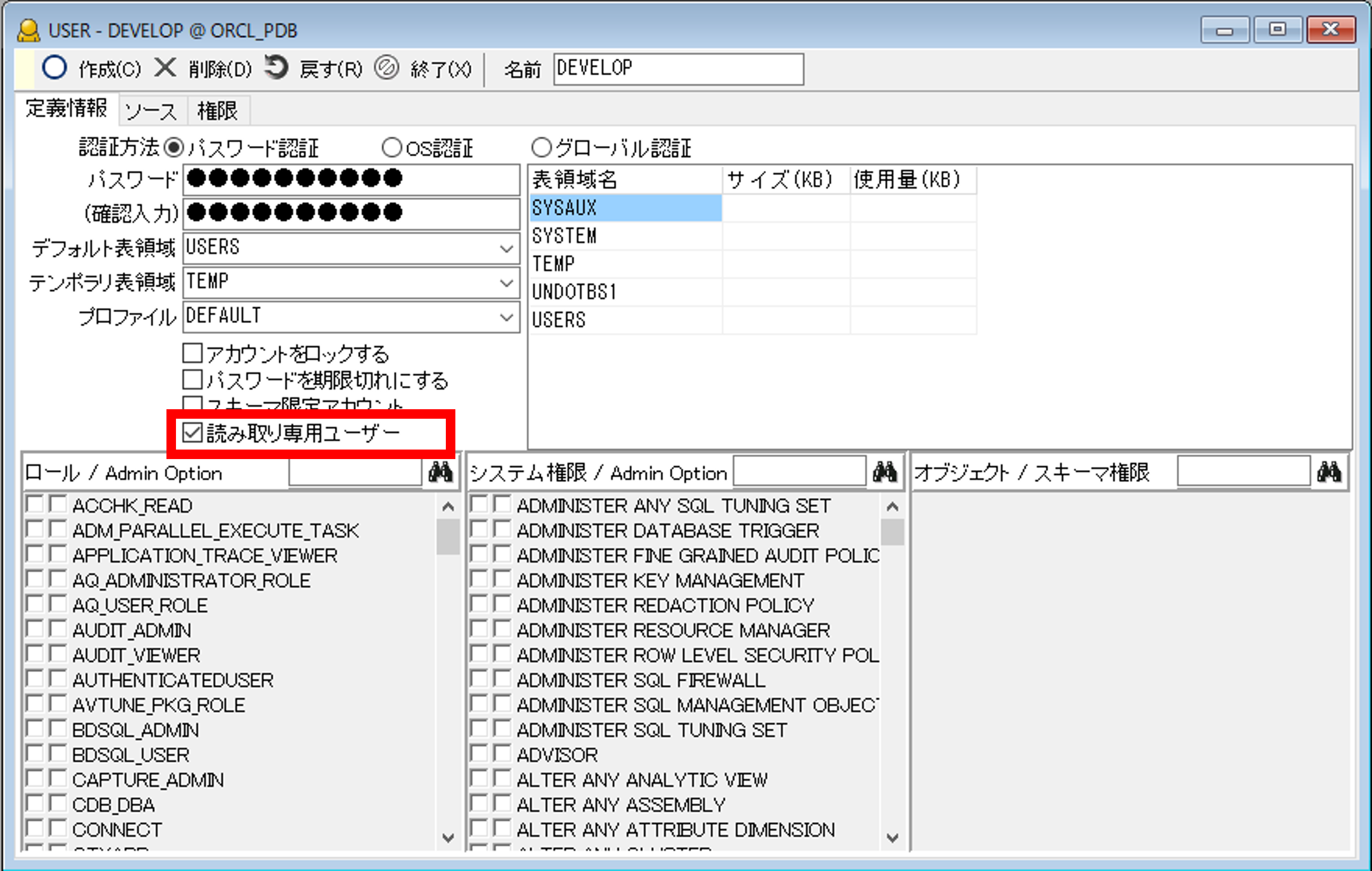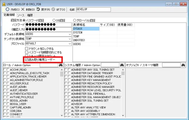 また、Oracle23aiの新機能である「読み取り専用ユーザー」にも対応しました。読み取り専用ユーザーとはその名の通り、テーブルなどの参照のみ可能なユーザーのことです。Oracle23aiに接続時はユーザー画面の定義情報タブに「読み取り専用ユーザー」が追加されますので、ONにすることで、他の権限に限らず読み取り専用のユーザーとなります。