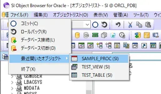 また、Oracle23ai新機能以外の機能として、過去に開いたことのあるオブジェクトを簡単に再表示できる機能も追加しました。「ファイル」メニュー>「最近開いたオブジェクト」より直近で開いたオブジェクトが最大10個まで表示されますので、ここから開きたいオブジェクトを選択することで即座に再表示が可能です!