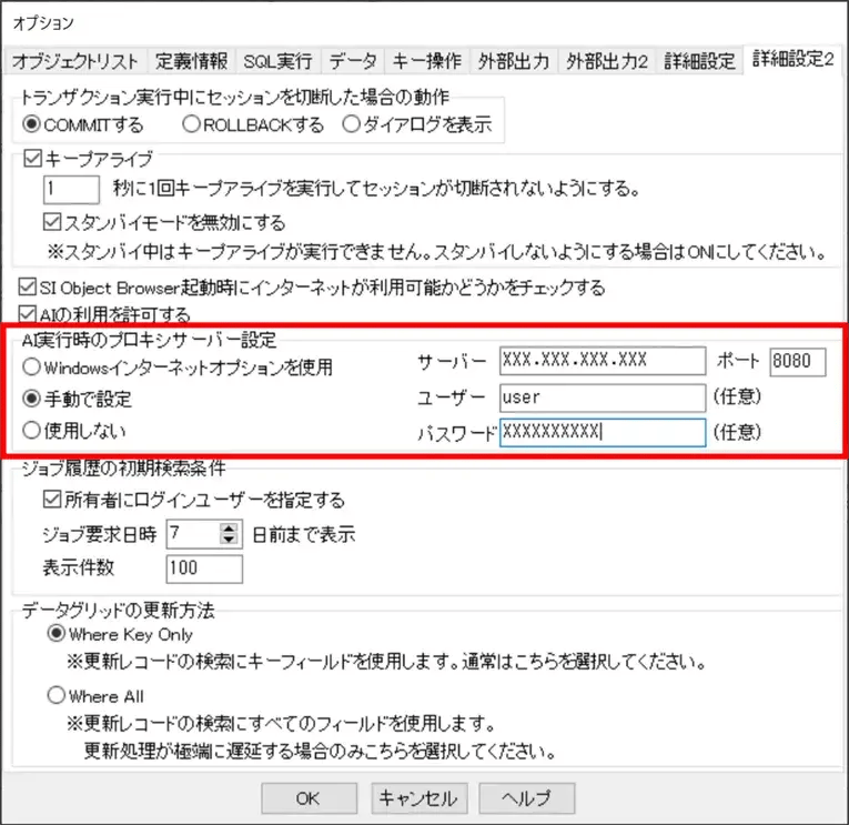 生成AI機能では外部にリクエストを送信しますが、自社のセキュリティ設定により、SI Object BrowserをインストールしたPCからプロキシサーバー経由でしか外部インターネットに接続できない環境では利用できないかたちとなっていました。最新バージョンではでプロキシサーバーの設定を行うことで、このような環境でも生成連携機能が実行できるように改善いたしました。オプション画面の「詳細設定2」タブにある「AI実行時のプロキシサーバー設定」でプロキシサーバーの設定が可能となっています。