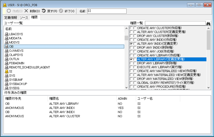 最新バージョンでOracle23aiに接続時は、ユーザー画面に「権限」タブが追加されますので、権限の種類と、付与先のユーザーを指定することでスキーマ権限が設定できます。