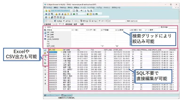 Excelのような操作感覚で、データの挿入・編集・削除操作が可能です。その他、ExcelやCSVの出力、専用の検索フィルタにより絞り込み操作も簡単にできます。SQLの知識がなくてもデータのメンテナンスや検索・抽出が可能となっています。