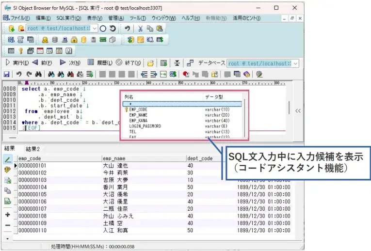 また、エンジニアの方向けに直接SQLを記述して実行する画面も用意しています。当画面ではSQL入力中にテーブルやカラムの候補を表示するコードアシスタント機能が搭載されており、効率よくSQLを作成できます。