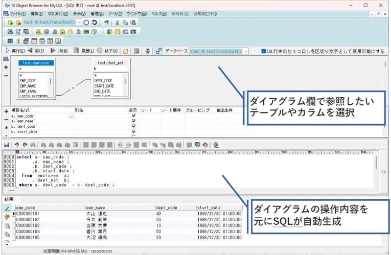 また、SQLをGUI操作で組み立てる「SQLビルダ」機能も用意されています。上部のダイアグラム欄で取得したいテーブルやカラムを選択することで、自動的にSQLが組み立てられるため、SQLの知識がない方でも複数テーブルを結合したデータなど、複雑なデータも抽出することが可能です。