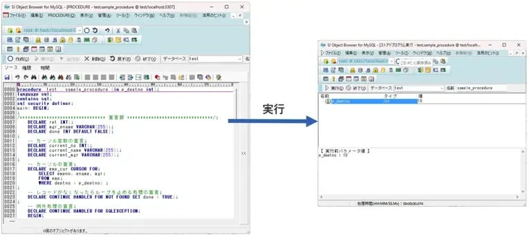 また、ストアドプログラムの開発もサポートしています。専用のスクリーンエディタで開発・コンパイルができる他、パラメータを指定して実行することもできます。