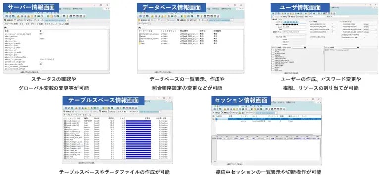 データベース管理者向けの機能も搭載しています。データベースやユーザーの作成、権限管理やロック情報の確認などの操作が可能です。