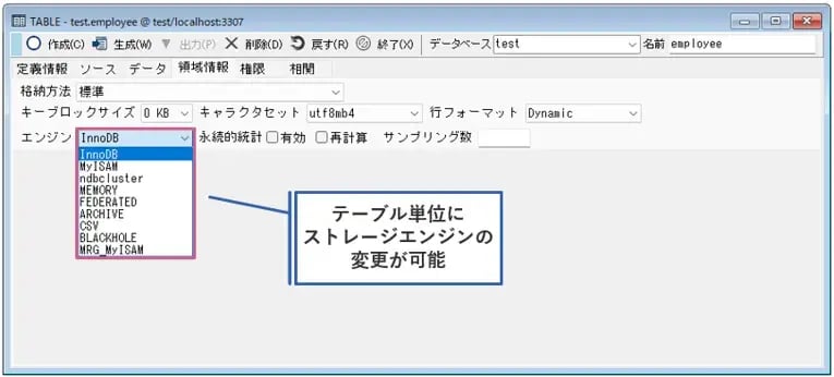 MySQL独自の機能である「ストレージエンジン」に対応しています。ストレージエンジンとはデータの取得や保存や管理方法の定義セットであり、主要なストレージエンジンとしてはトランザクション管理や障害回復に強い「InnoDB」と、読み取り性能に優れた「MyISAM」、メモリを使用する「MEMORY」等があります。SI Object Browser for MySQLでは、テーブル単位にこれらストレージエンジンの切り替えが可能となっています。