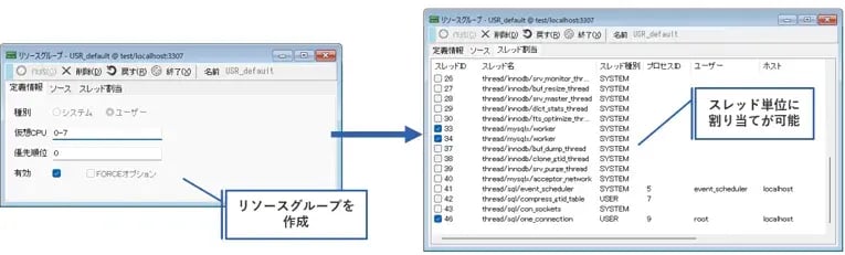 リソースグループとはパフォーマンスの調整用にスレッド(プロセス)単位にCPUコア数の上限を設定できる機能です。SI Object Browser for MySQLではリソースグループ専用の画面が用意されており、リソースグループの定義からスレッドの割り当てまで可能です。